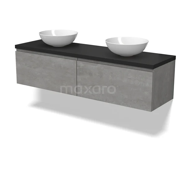 Modulo Plato Badmöbel mit Aufsatzwaschbecken | 160 cm Hellgrauer Beton Grifflos front Matt Schwarz blatt 2 nebeneinanderliegende Schubladen