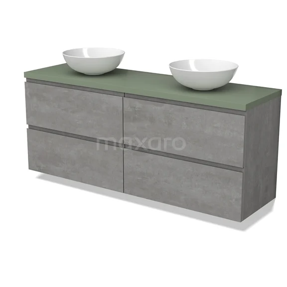 Modulo Plato Badmöbel mit Aufsatzwaschbecken | 160 cm Hellgrauer Beton Grifflos front Salbeigrün blatt 4 Schubladen