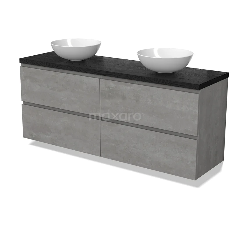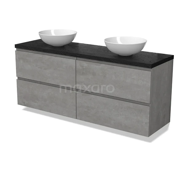 Modulo Plato Badmöbel mit Aufsatzwaschbecken | 160 cm Hellgrauer Beton Grifflos front Schwarze Eiche blatt 4 Schubladen