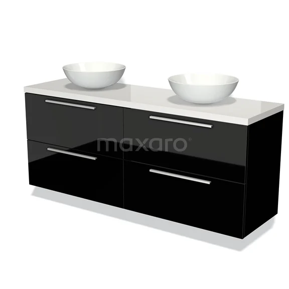 Modulo Plato Badmöbel mit Aufsatzwaschbecken | 160 cm Hochglanz Schwarz Flach front Hochglanz Weiß blatt 4 Schubladen