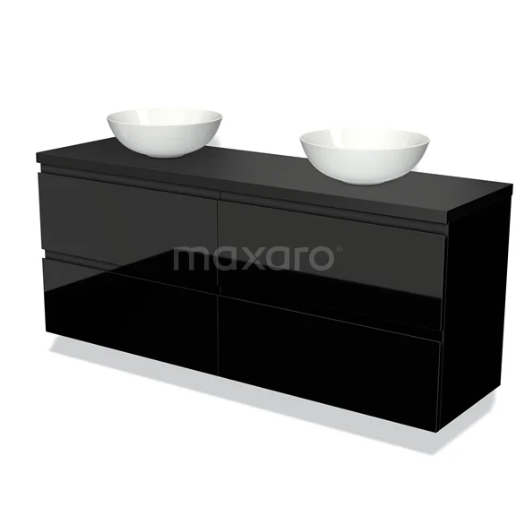 Modulo Plato Badmöbel mit Aufsatzwaschbecken | 160 cm Hochglanz Schwarz Grifflos front Matt Schwarz blatt 4 Schubladen