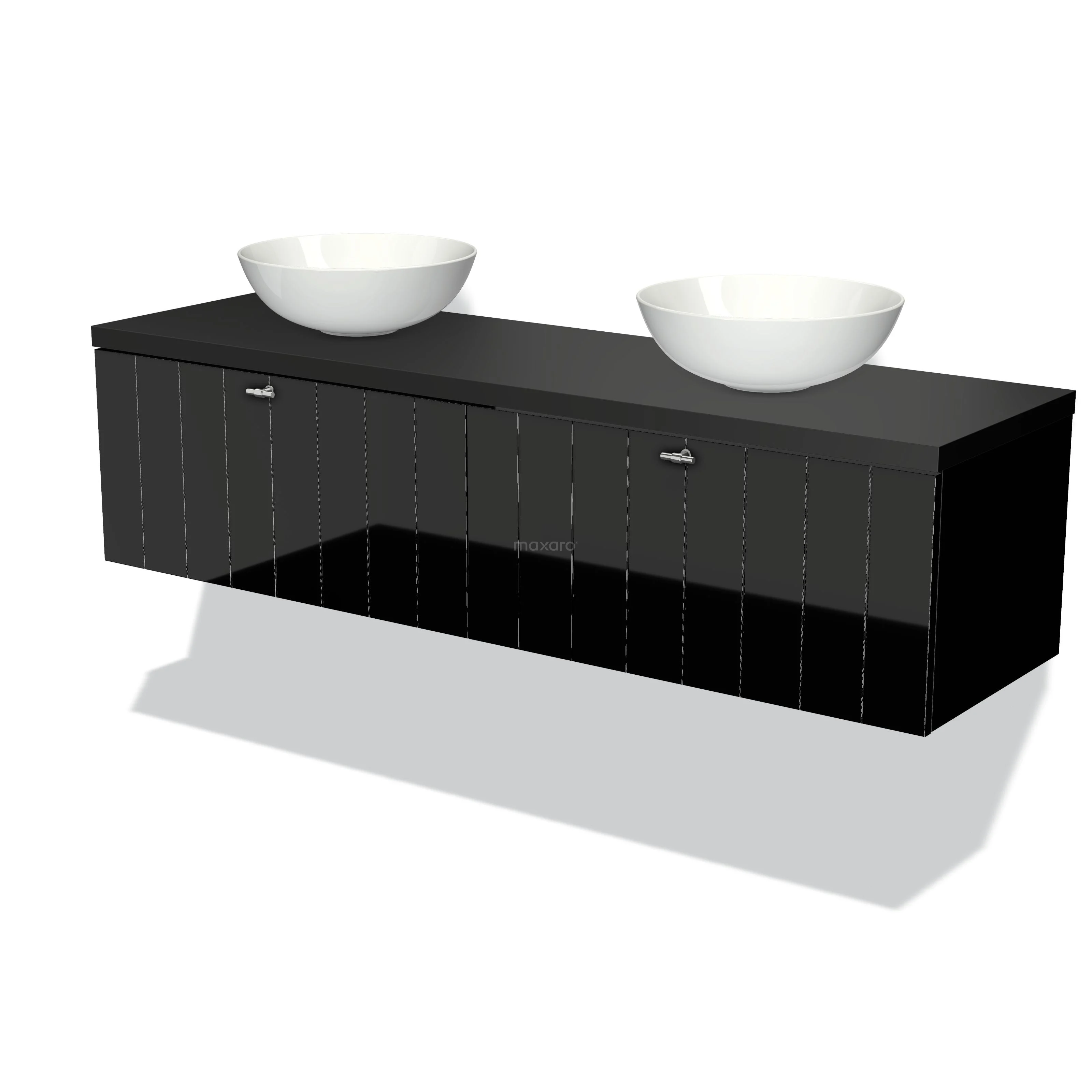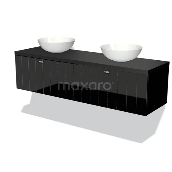 Modulo Plato Badmöbel mit Aufsatzwaschbecken | 160 cm Hochglanz Schwarz Lamelle front Matt Schwarz blatt 2 nebeneinanderliegende Schubladen