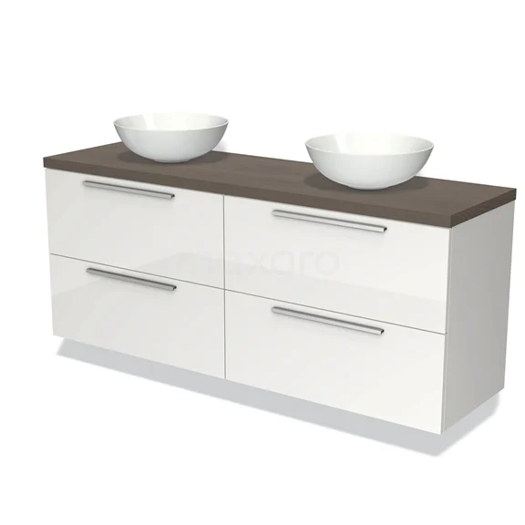 Modulo Plato Badmöbel mit Aufsatzwaschbecken | 160 cm Hochglanz Weiß Flach front Dunkelbraune Eiche blatt 4 Schubladen