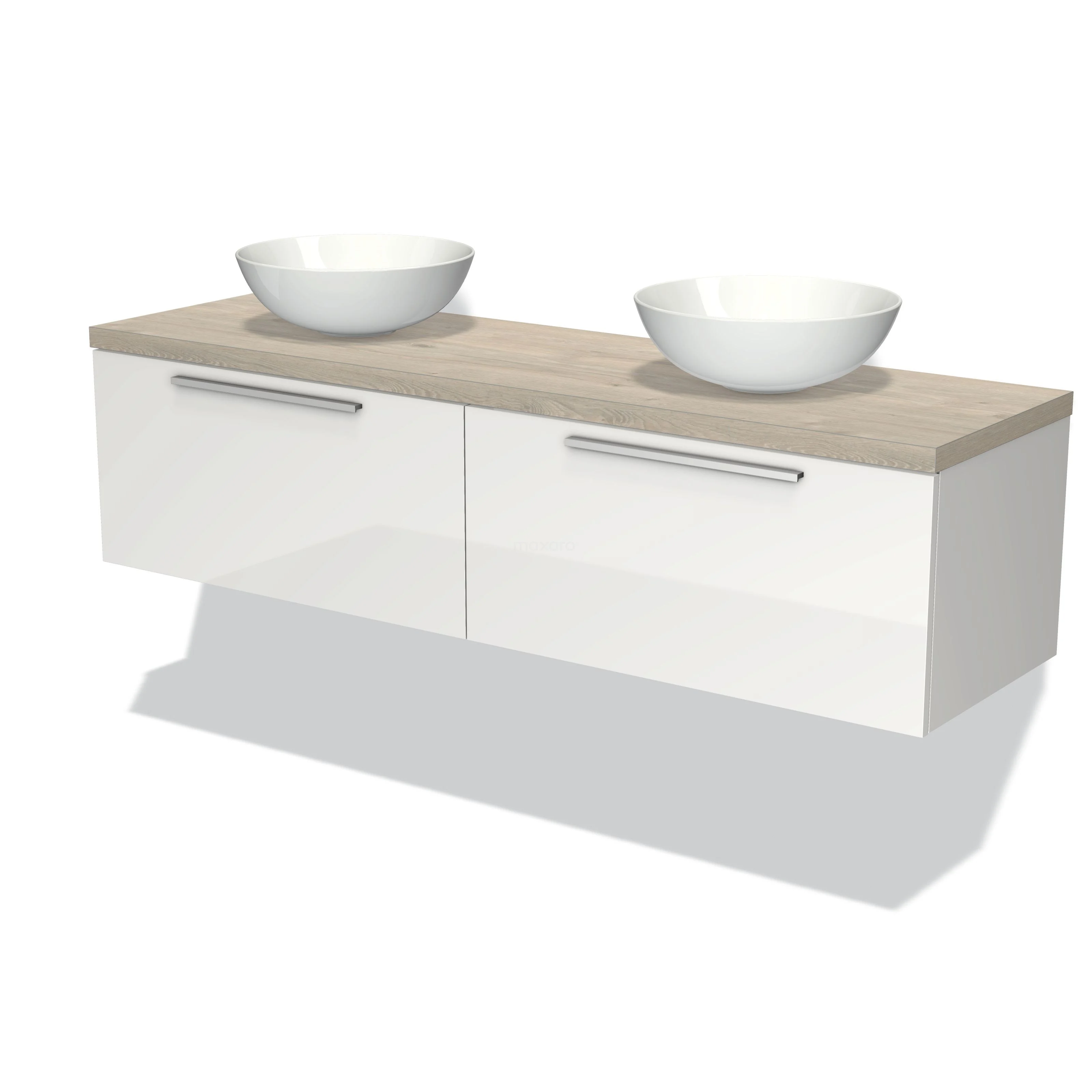 Modulo Plato Badmöbel mit Aufsatzwaschbecken | 160 cm Hochglanz Weiß Flach front Hellgraue Eiche blatt 2 nebeneinanderliegende Schubladen