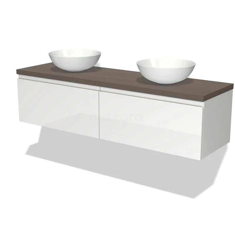 Modulo Plato Badmöbel mit Aufsatzwaschbecken | 160 cm Hochglanz Weiß Grifflos front Dunkelbraune Eiche blatt 2 nebeneinanderliegende Schubladen