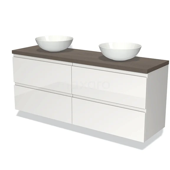 Modulo Plato Badmöbel mit Aufsatzwaschbecken | 160 cm Hochglanz Weiß Grifflos front Dunkelbraune Eiche blatt 4 Schubladen