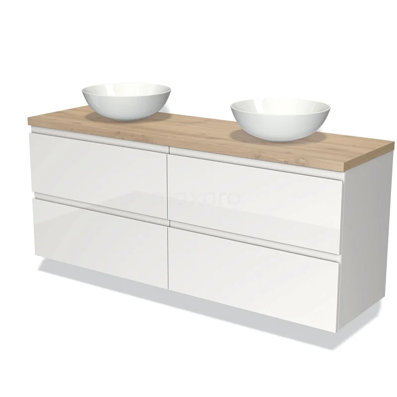 Modulo Plato Badmöbel mit Aufsatzwaschbecken | 160 cm Hochglanz Weiß Grifflos front Hellbraune Eiche blatt 4 Schubladen