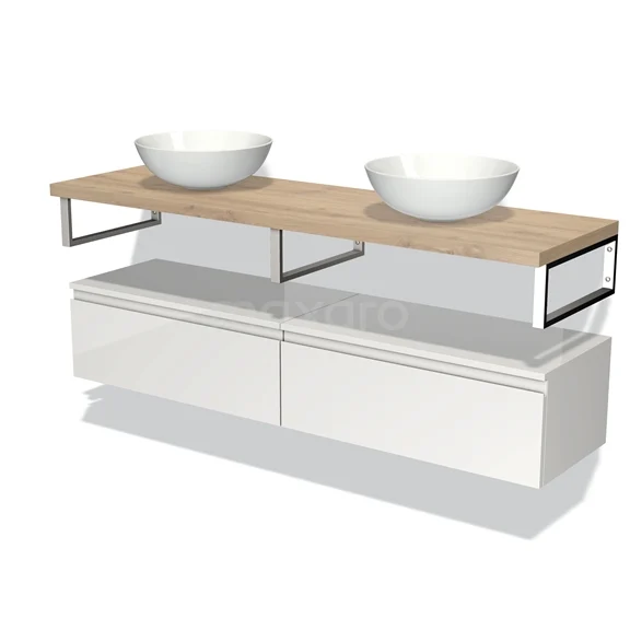 Modulo Plato Badmöbel mit Aufsatzwaschbecken | 160 cm Hochglanz Weiß Grifflos front Hellbraune Eiche blatt Tief hängend