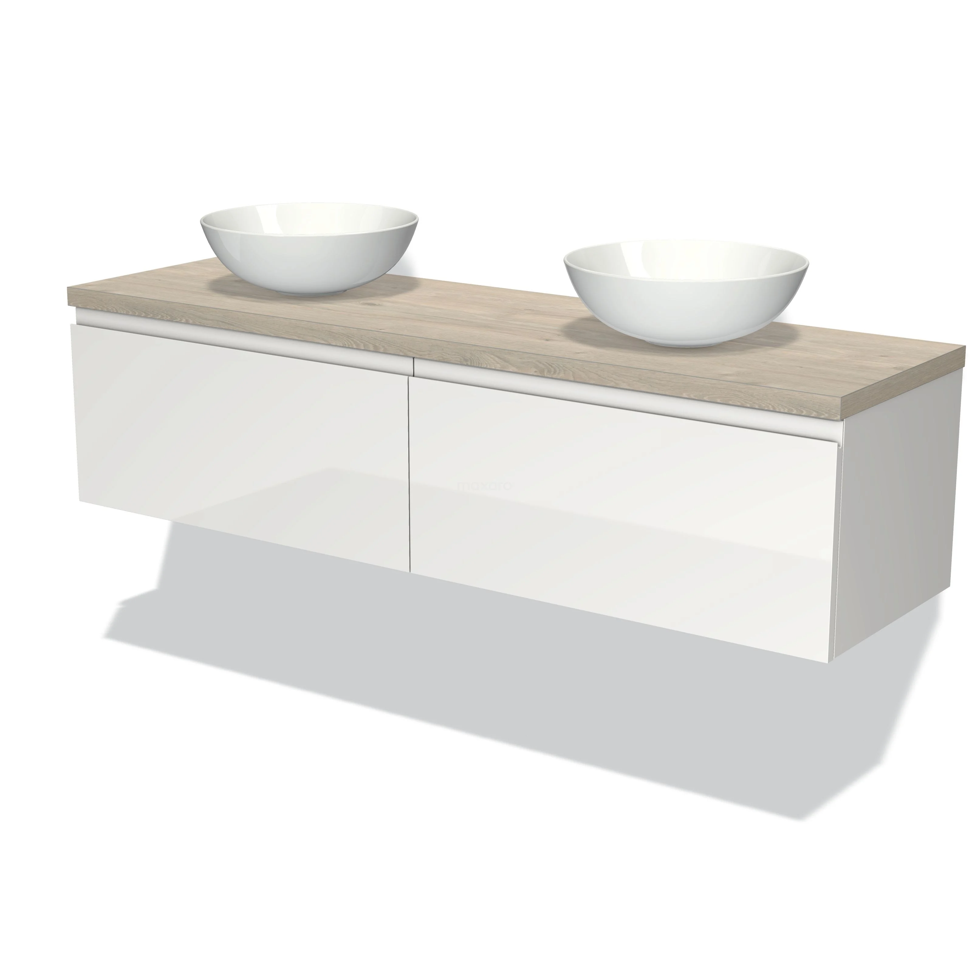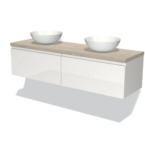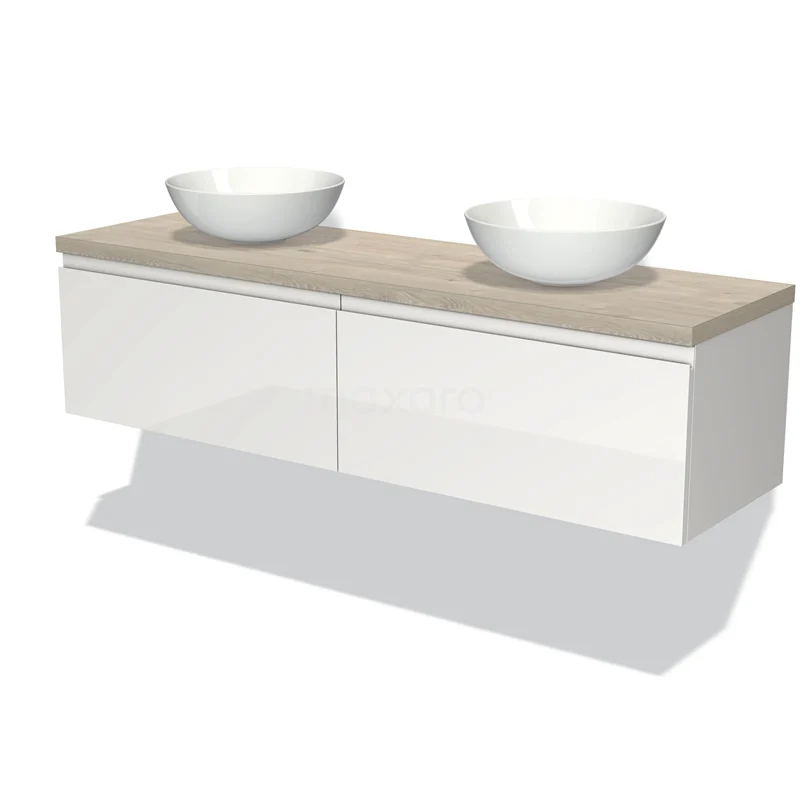 Modulo Plato Badmöbel mit Aufsatzwaschbecken | 160 cm Hochglanz Weiß Grifflos front Hellgraue Eiche blatt 2 nebeneinanderliegende Schubladen