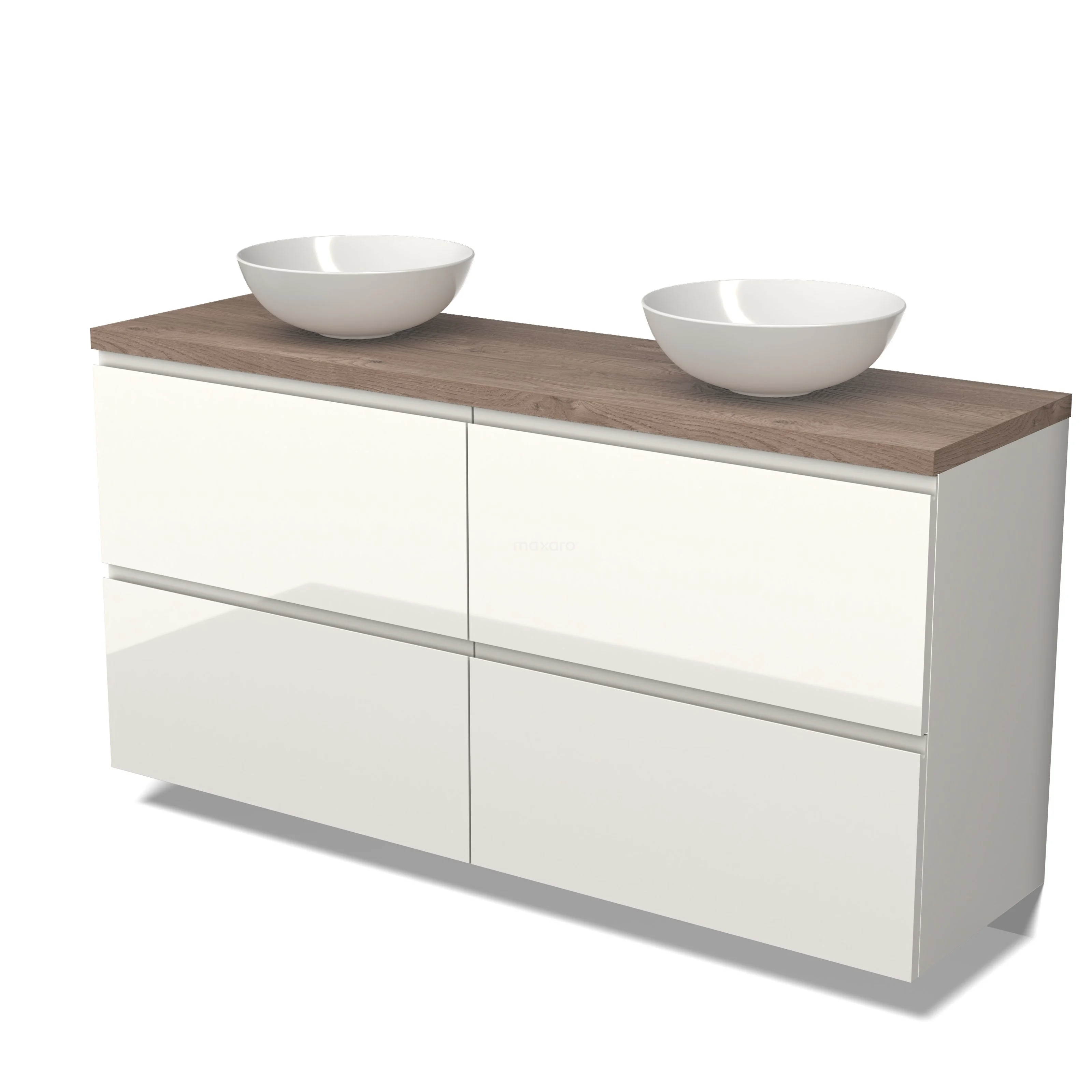 Modulo Plato Badmöbel mit Aufsatzwaschbecken | 160 cm Hochglanz Weiß Grifflos front Mittelbraune Eiche blatt 4 hohe Schubladen
