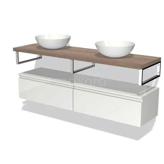 Modulo Plato Badmöbel mit Aufsatzwaschbecken | 160 cm Hochglanz Weiß Grifflos front Mittelbraune Eiche blatt Tief hängend