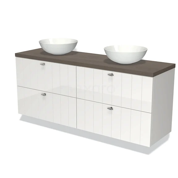 Modulo Plato Badmöbel mit Aufsatzwaschbecken | 160 cm Hochglanz Weiß Lamelle front Dunkelbraune Eiche blatt 4 Schubladen