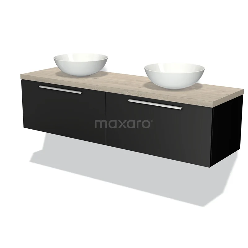 Modulo Plato Badmöbel mit Aufsatzwaschbecken | 160 cm Matt Schwarz Flach front Hellgraue Eiche blatt 2 nebeneinanderliegende Schubladen