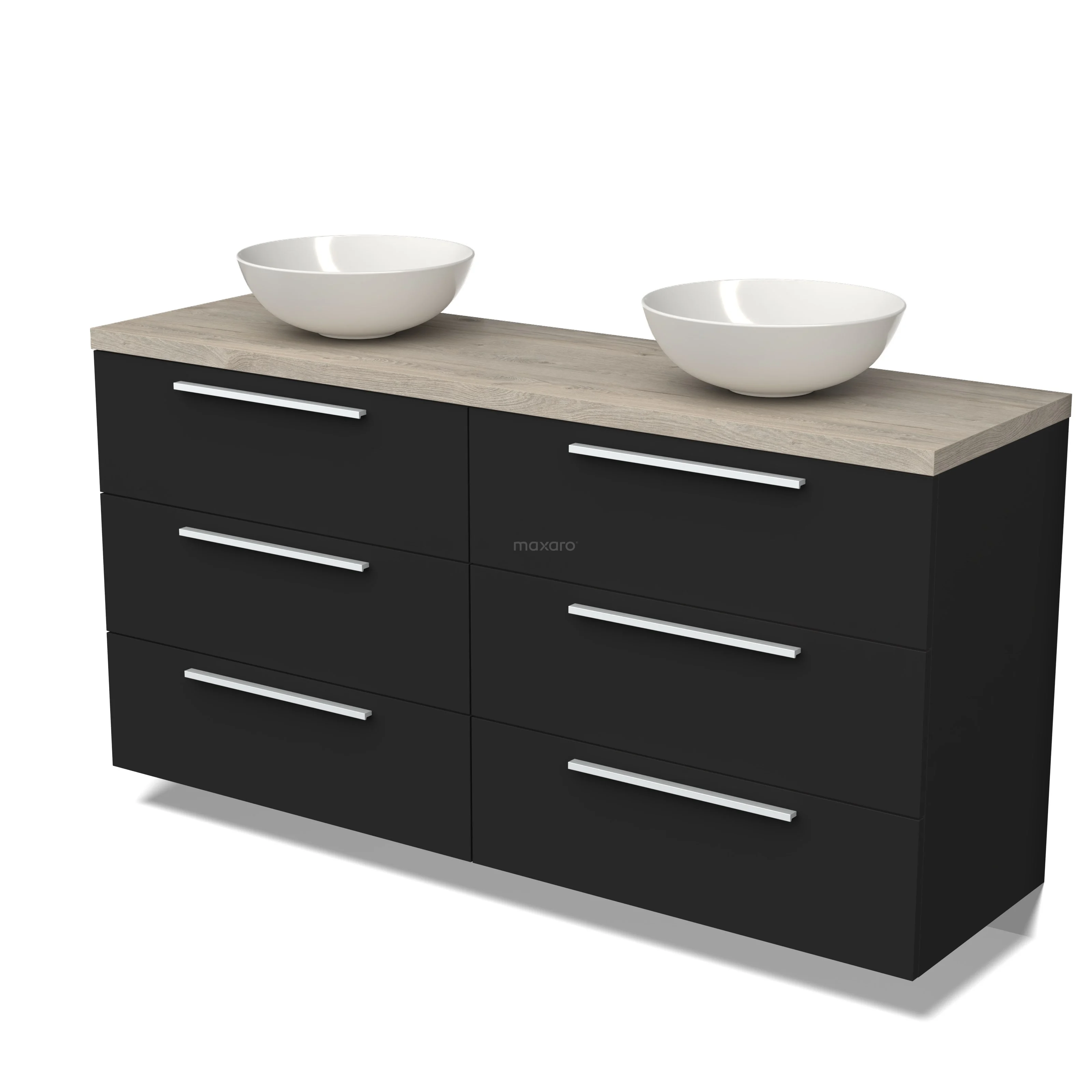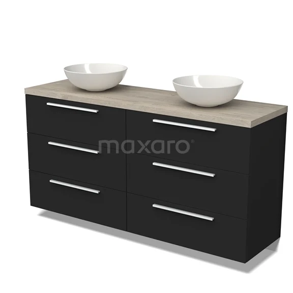 Modulo Plato Badmöbel mit Aufsatzwaschbecken | 160 cm Matt Schwarz Flach front Hellgraue Eiche blatt 6 Schubladen