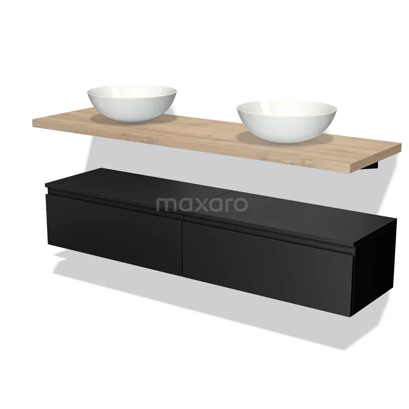 Modulo Plato Badmöbel mit Aufsatzwaschbecken | 160 cm Matt Schwarz Grifflos front Hellbraune Eiche blatt Tief hängend