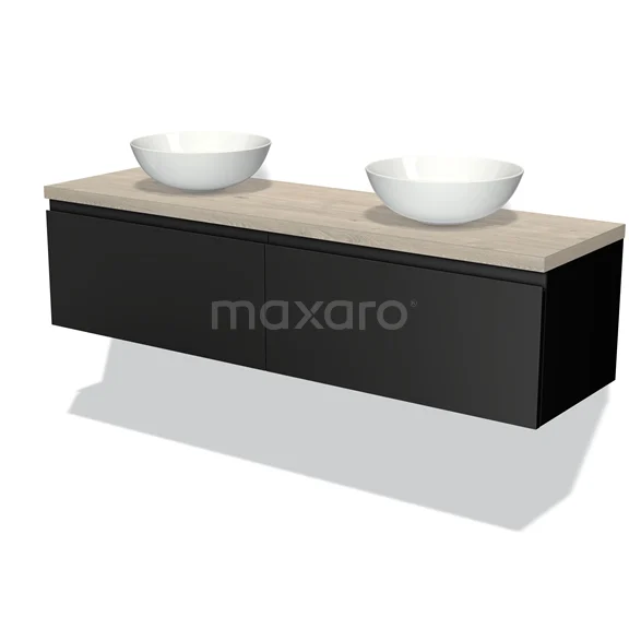 Modulo Plato Badmöbel mit Aufsatzwaschbecken | 160 cm Matt Schwarz Grifflos front Hellgraue Eiche blatt 2 nebeneinanderliegende Schubladen