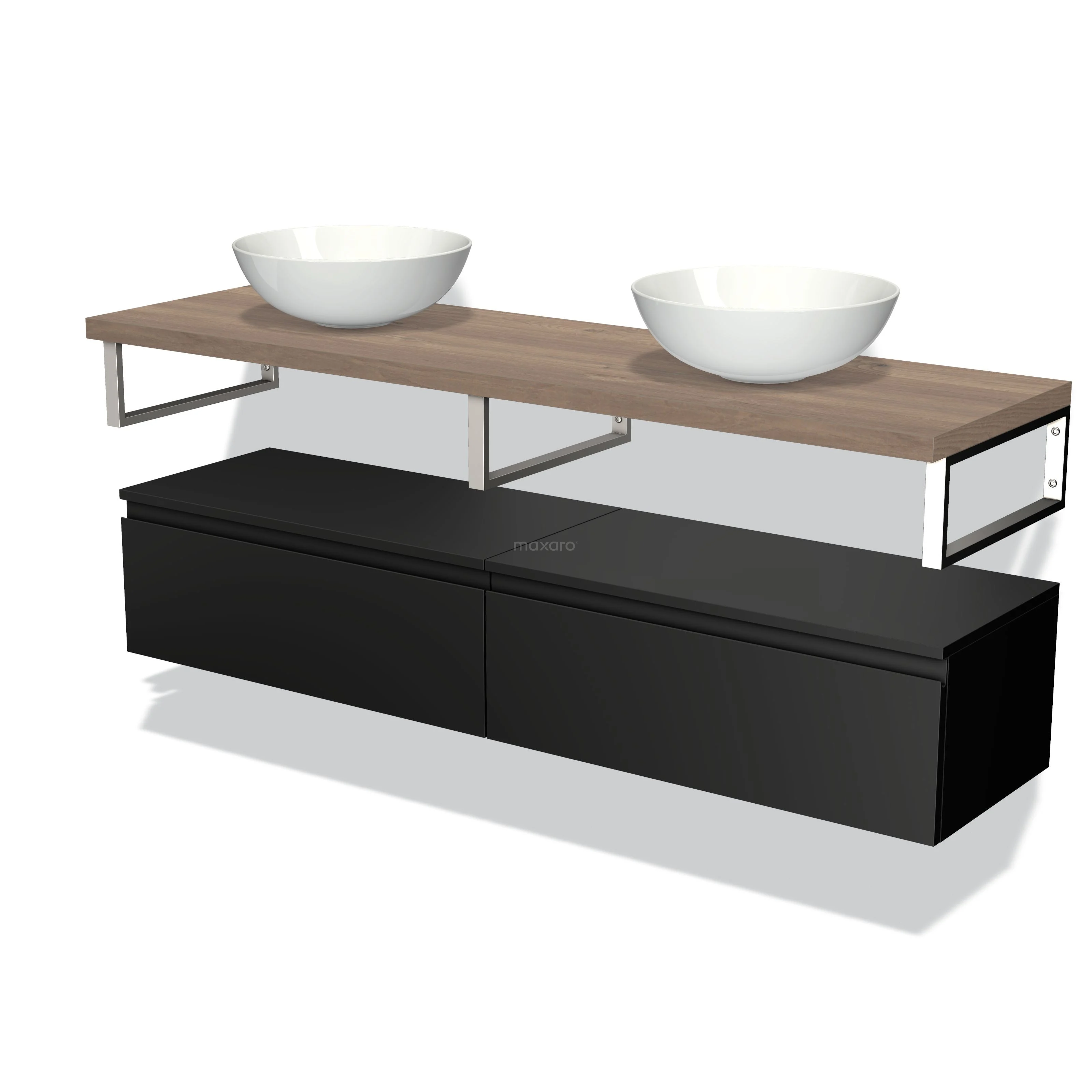 Modulo Plato Badmöbel mit Aufsatzwaschbecken | 160 cm Matt Schwarz Grifflos front Mittelbraune Eiche blatt Tief hängend