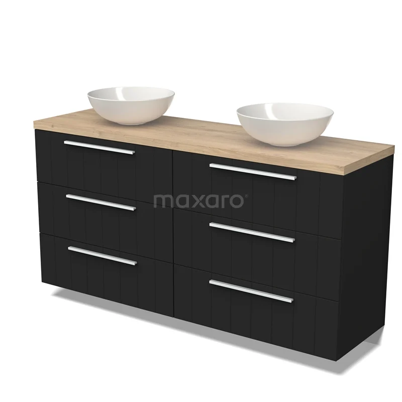 Modulo Plato Badmöbel mit Aufsatzwaschbecken | 160 cm Matt Schwarz Lamelle front Hellbraune Eiche blatt 6 Schubladen