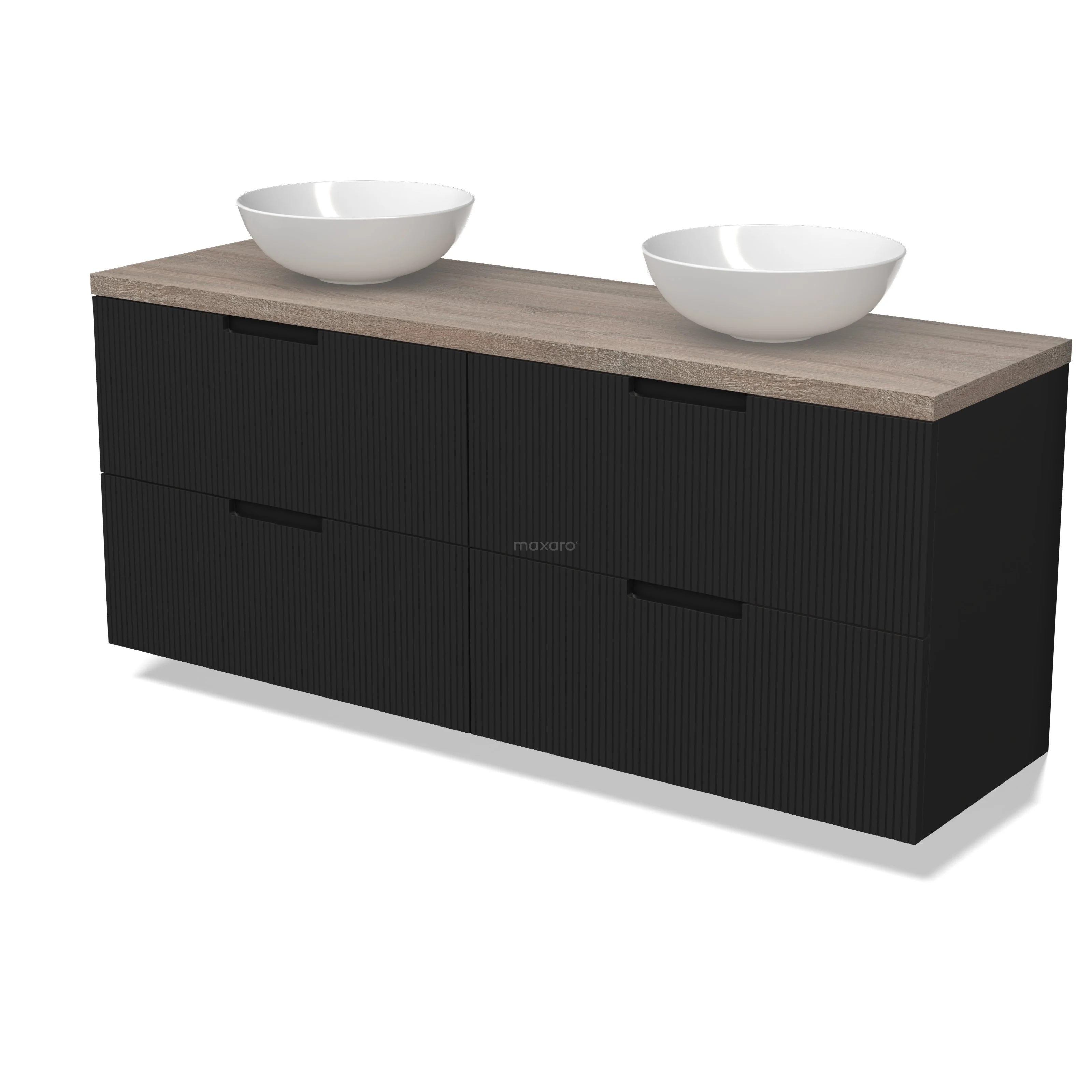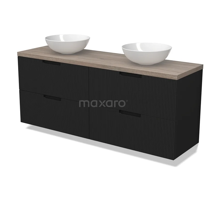 Modulo Plato Badmöbel mit Aufsatzwaschbecken | 160 cm Matt Schwarz Linie front Eiche blatt 4 Schubladen