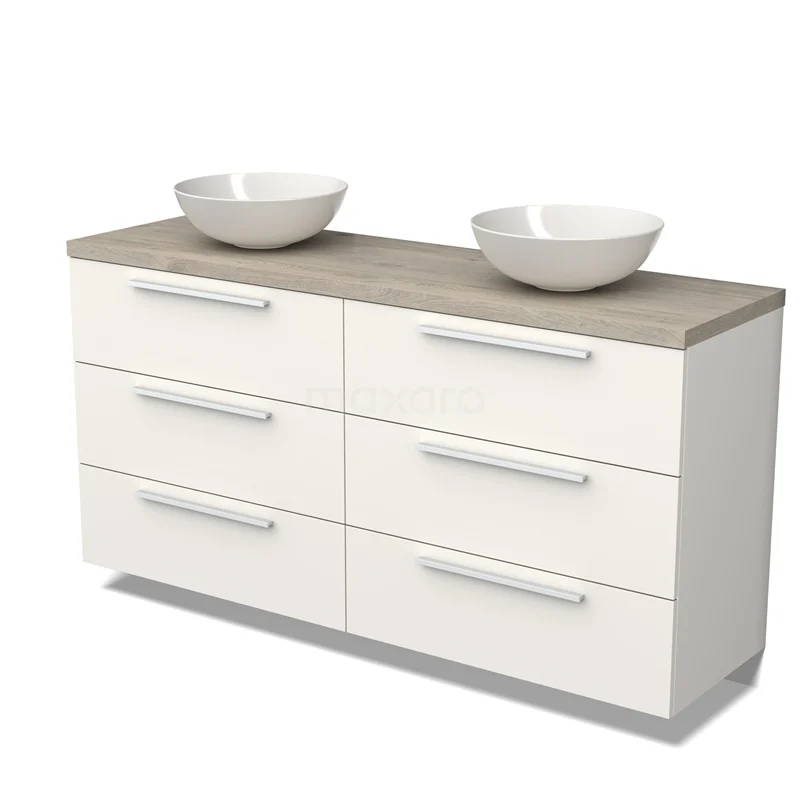 Modulo Plato Badmöbel mit Aufsatzwaschbecken | 160 cm Matt Weiß Flach front Hellgraue Eiche blatt 6 Schubladen
