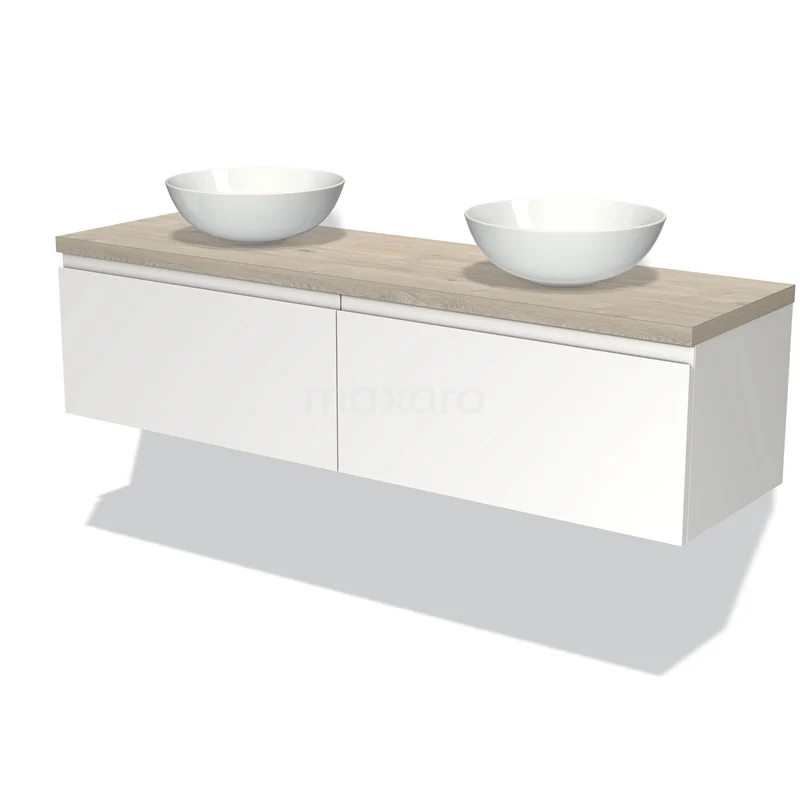 Modulo Plato Badmöbel mit Aufsatzwaschbecken | 160 cm Matt Weiß Grifflos front Hellgraue Eiche blatt 2 nebeneinanderliegende Schubladen