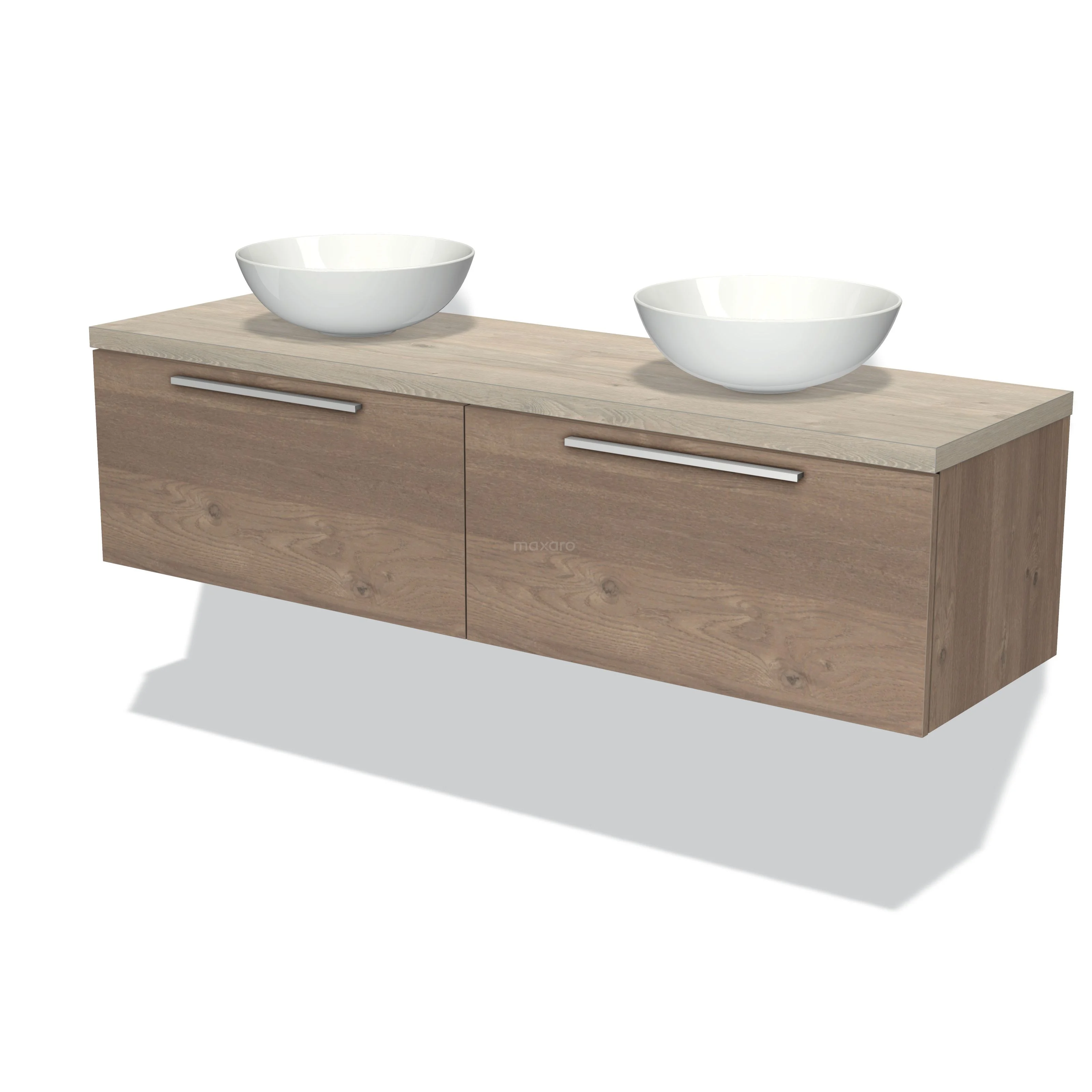 Modulo Plato Badmöbel mit Aufsatzwaschbecken | 160 cm Mittelbraune Eiche Flach front Hellgraue Eiche blatt 2 nebeneinanderliegende Schubladen