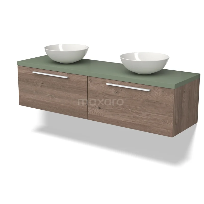 Modulo Plato Badmöbel mit Aufsatzwaschbecken | 160 cm Mittelbraune Eiche Flach front Salbeigrün blatt 2 nebeneinanderliegende Schubladen