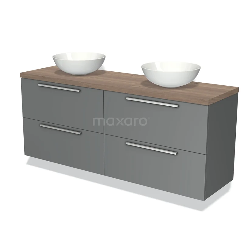 Modulo Plato Badmöbel mit Aufsatzwaschbecken | 160 cm Mittelgrau Flach front Mittelbraune Eiche blatt 4 Schubladen
