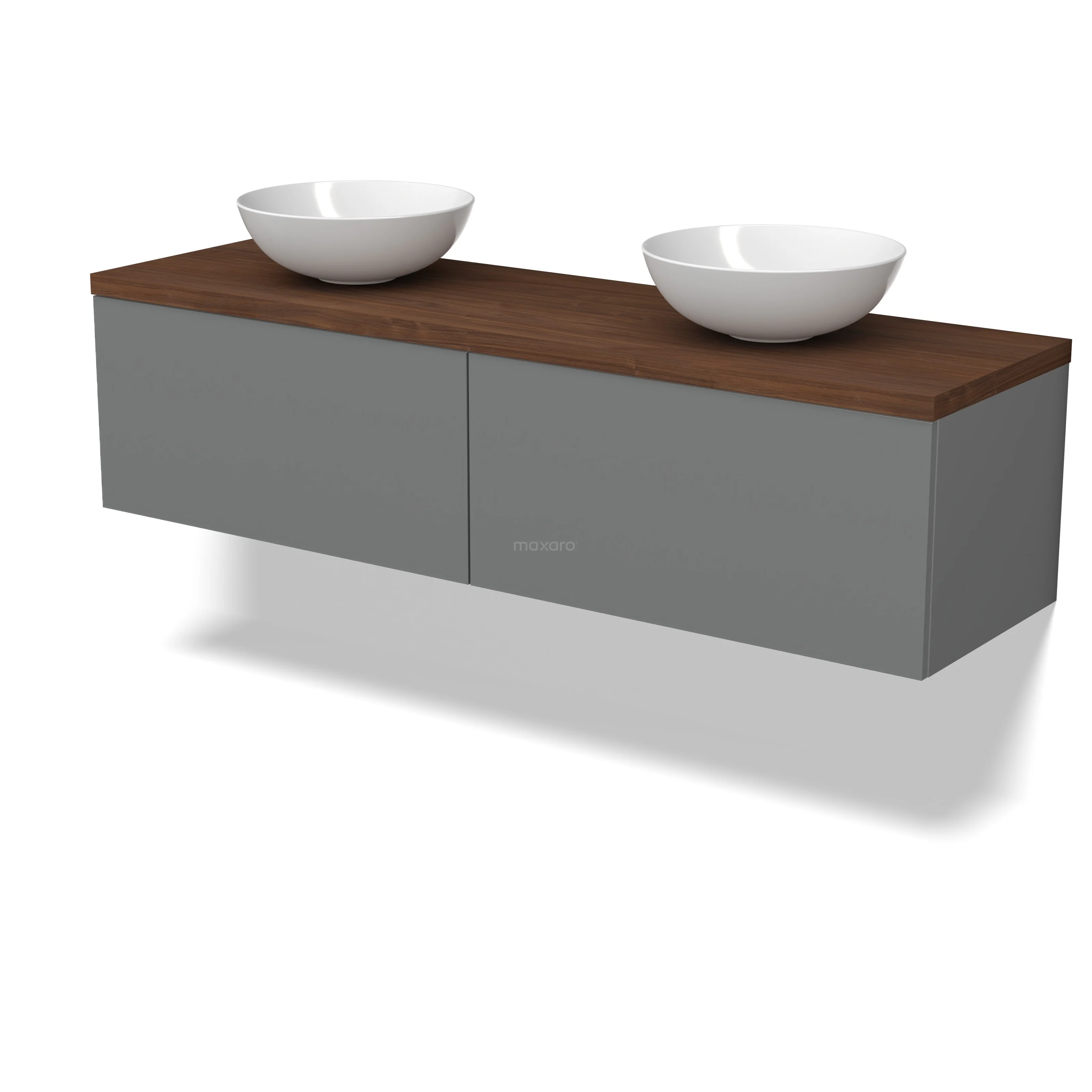 Modulo Plato Badmöbel mit Aufsatzwaschbecken | 160 cm Mittelgrau Flach front Walnuss blatt 2 nebeneinanderliegende Schubladen