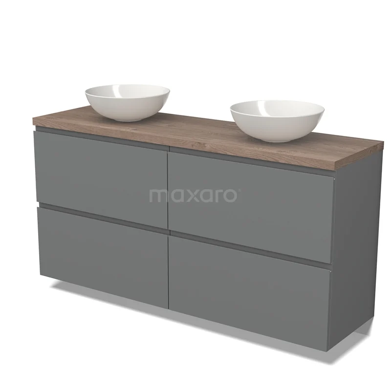 Modulo Plato Badmöbel mit Aufsatzwaschbecken | 160 cm Mittelgrau Grifflos front Mittelbraune Eiche blatt 4 hohe Schubladen