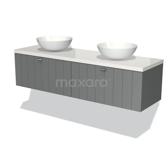 Modulo Plato Badmöbel mit Aufsatzwaschbecken | 160 cm Mittelgrau Lamelle front Hochglanz Weiß blatt 2 nebeneinanderliegende Schubladen