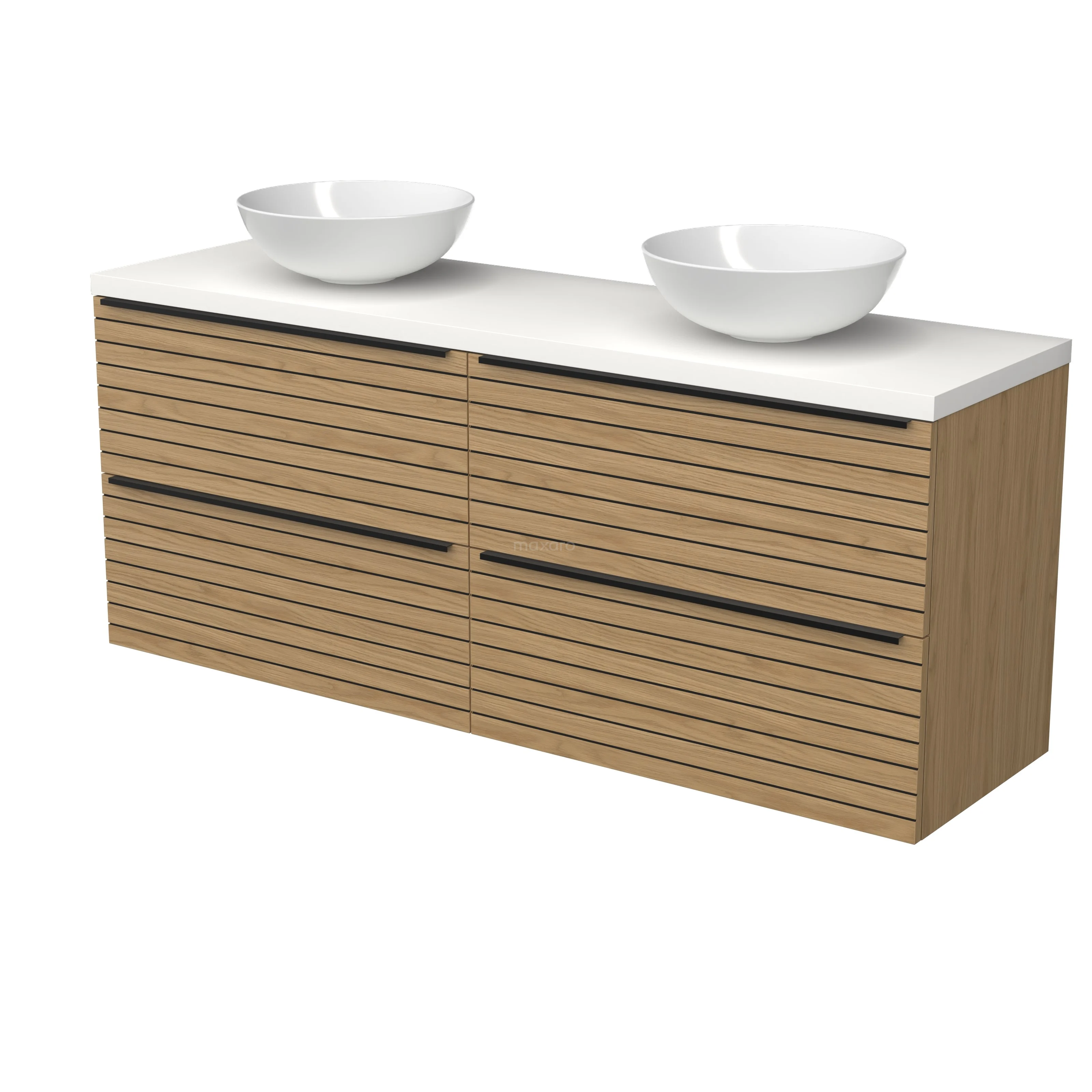 Modulo Plato Badmöbel mit Aufsatzwaschbecken | 160 cm Natürliches Furnier Streifen front Matt Weiß blatt 4 Schubladen