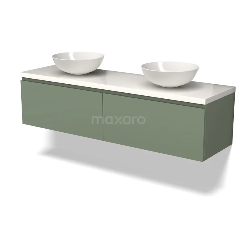 Modulo Plato Badmöbel mit Aufsatzwaschbecken | 160 cm Salbeigrün Grifflos front Hochglanz Weiß blatt 2 nebeneinanderliegende Schubladen