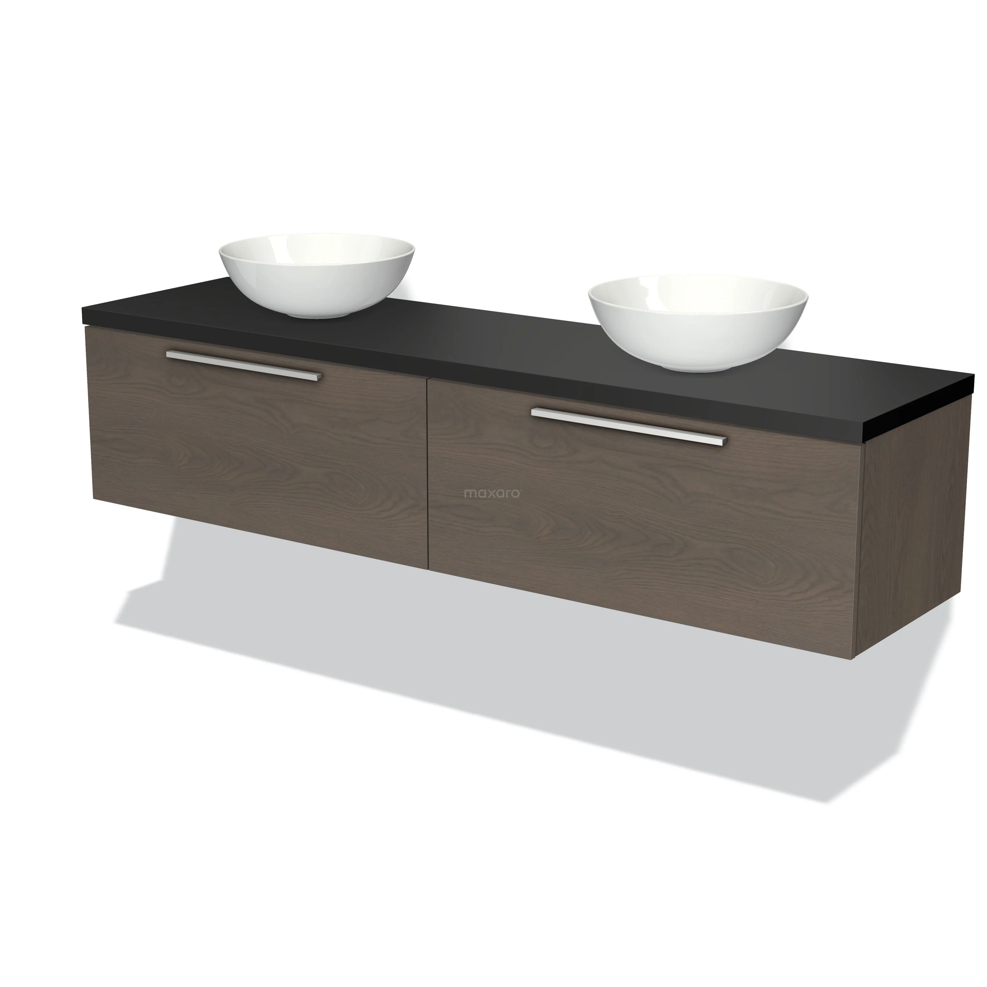 Modulo Plato Badmöbel mit Aufsatzwaschbecken | 180 cm Dunkelbraune Eiche Flach front Matt Schwarz blatt 2 nebeneinanderliegende Schubladen