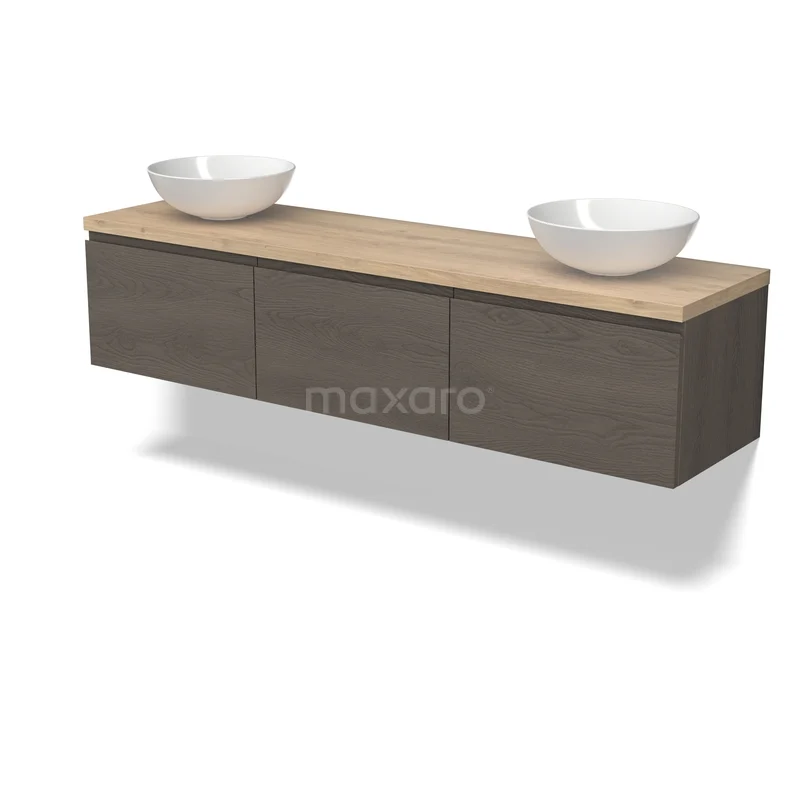 Modulo Plato Badmöbel mit Aufsatzwaschbecken | 180 cm Dunkelbraune Eiche Grifflos front Hellbraune Eiche blatt 3 nebeneinanderliegende Schubladen