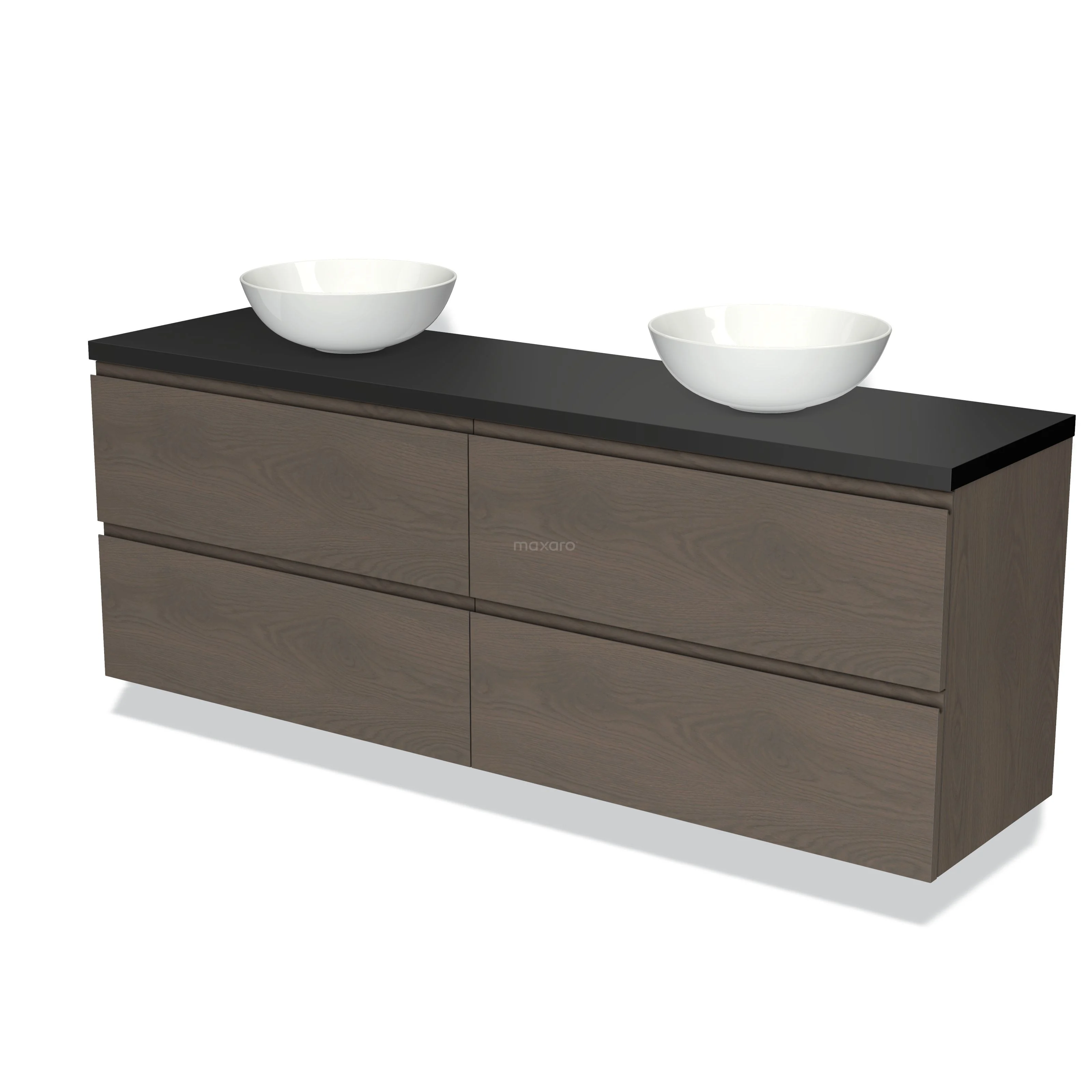 Modulo Plato Badmöbel mit Aufsatzwaschbecken | 180 cm Dunkelbraune Eiche Grifflos front Matt Schwarz blatt 4 Schubladen