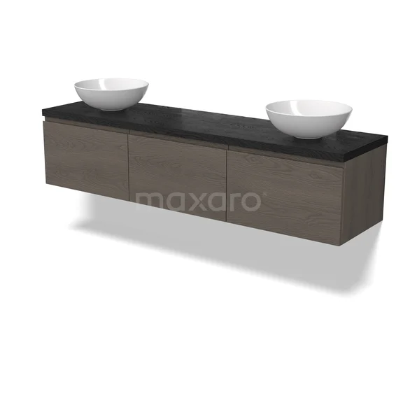 Modulo Plato Badmöbel mit Aufsatzwaschbecken | 180 cm Dunkelbraune Eiche Grifflos front Schwarze Eiche blatt 3 nebeneinanderliegende Schubladen