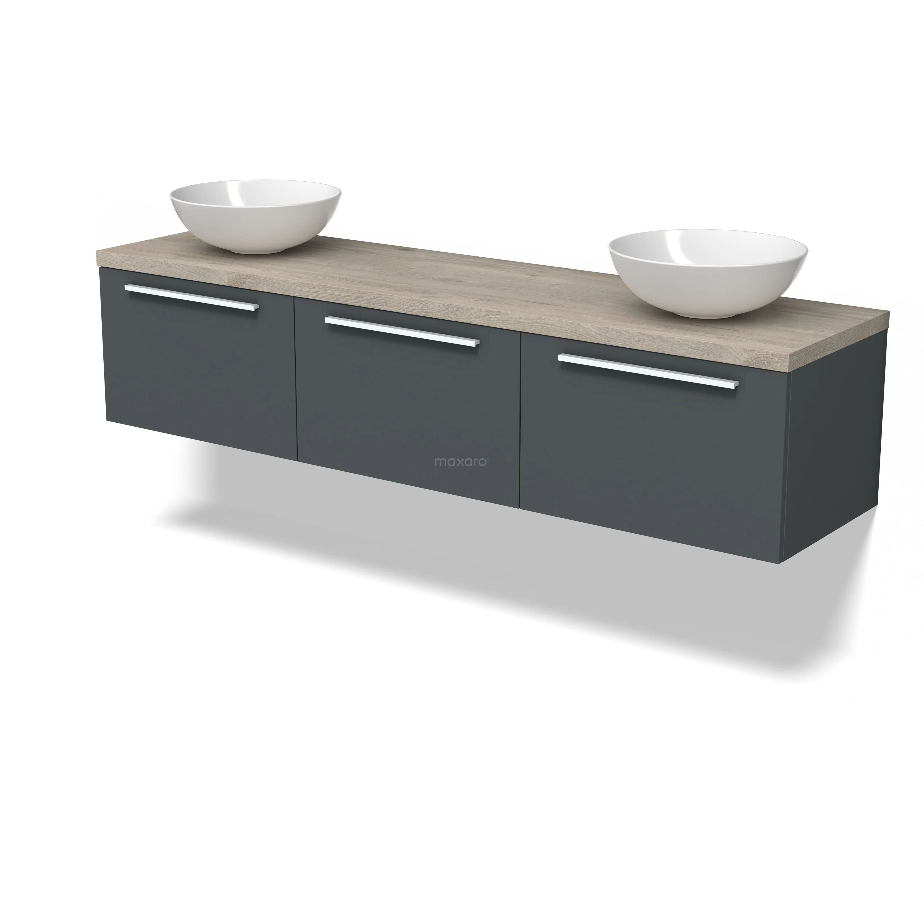 Modulo Plato Badmöbel mit Aufsatzwaschbecken | 180 cm Dunkelgrau Flach front Hellgraue Eiche blatt 3 nebeneinanderliegende Schubladen