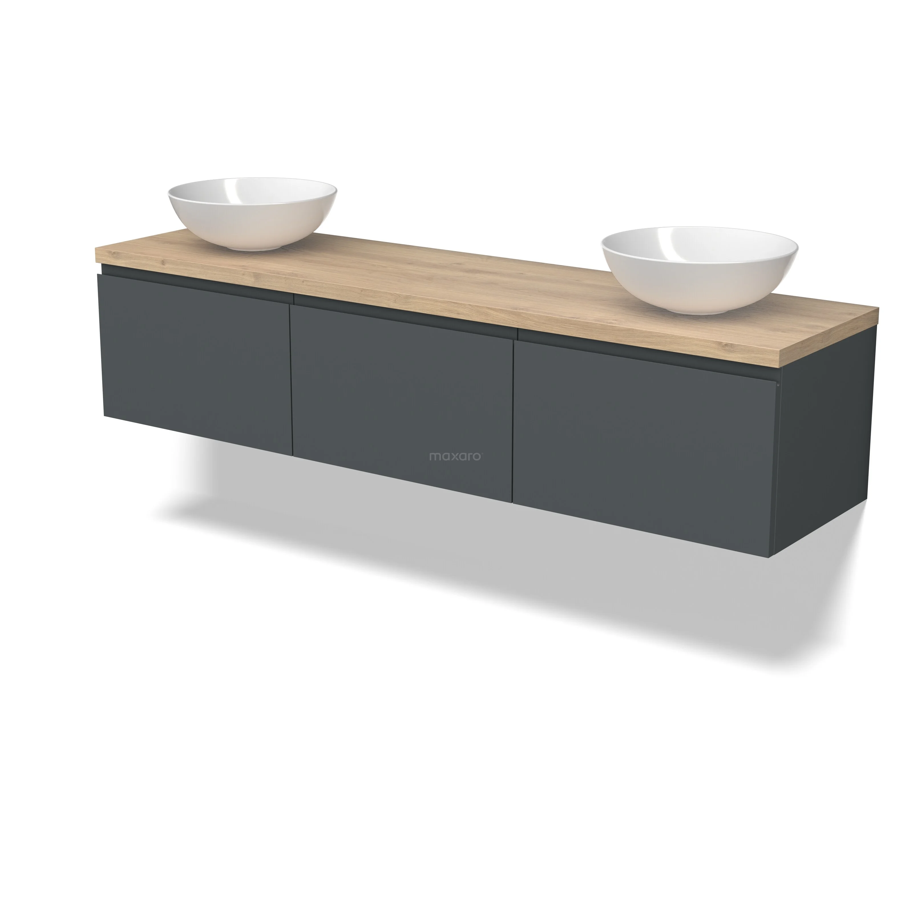 Modulo Plato Badmöbel mit Aufsatzwaschbecken | 180 cm Dunkelgrau Grifflos front Hellbraune Eiche blatt 3 nebeneinanderliegende Schubladen