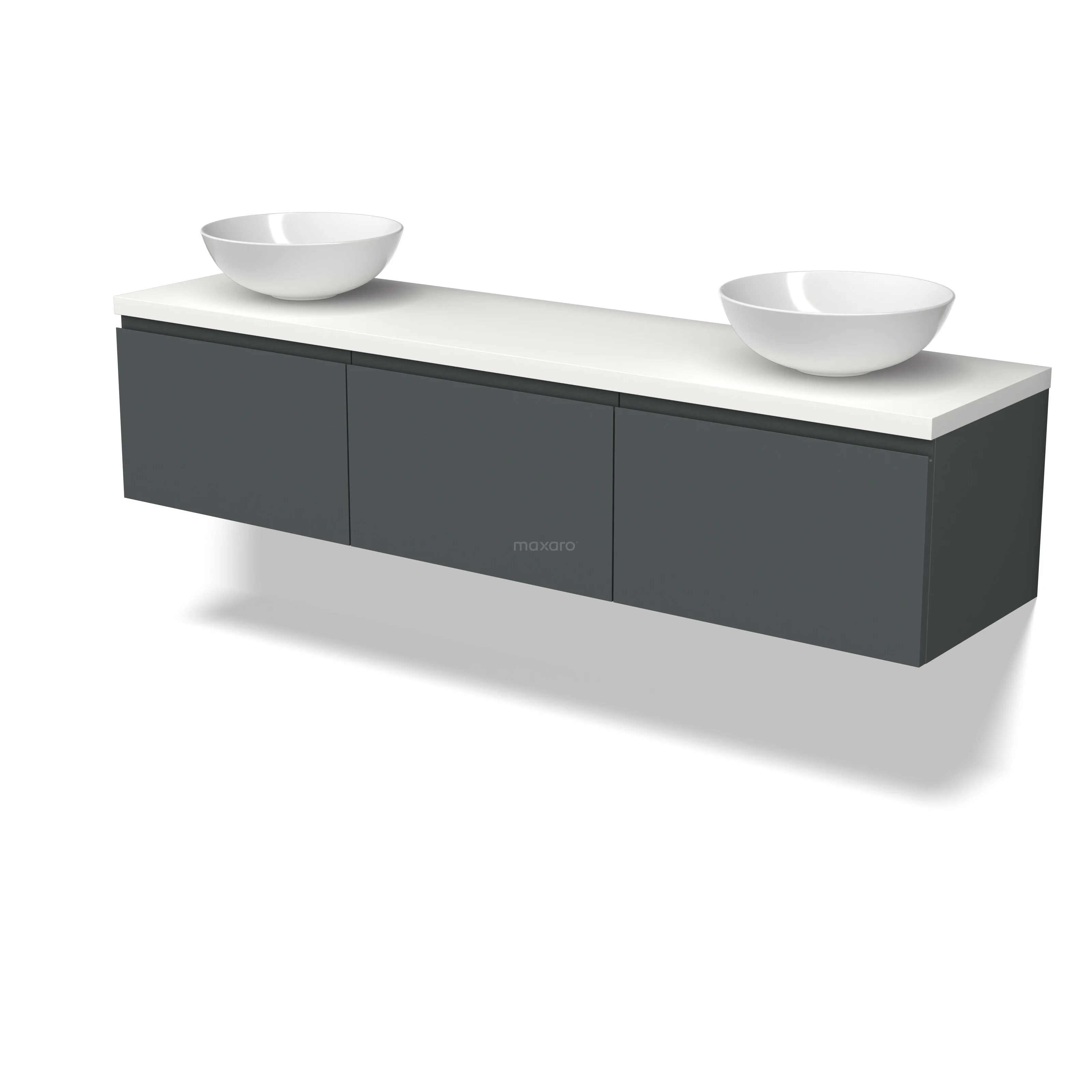 Modulo Plato Badmöbel mit Aufsatzwaschbecken | 180 cm Dunkelgrau Grifflos front Matt Weiß blatt 3 nebeneinanderliegende Schubladen