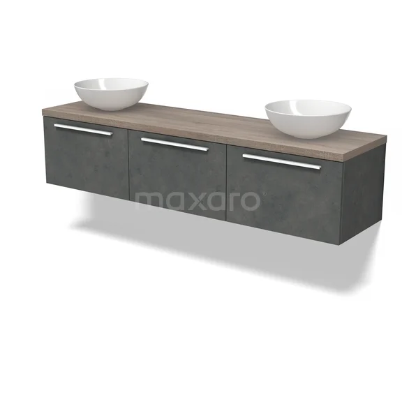 Modulo Plato Badmöbel mit Aufsatzwaschbecken | 180 cm Dunkelgrauer Beton Flach front Eiche blatt 3 nebeneinanderliegende Schubladen
