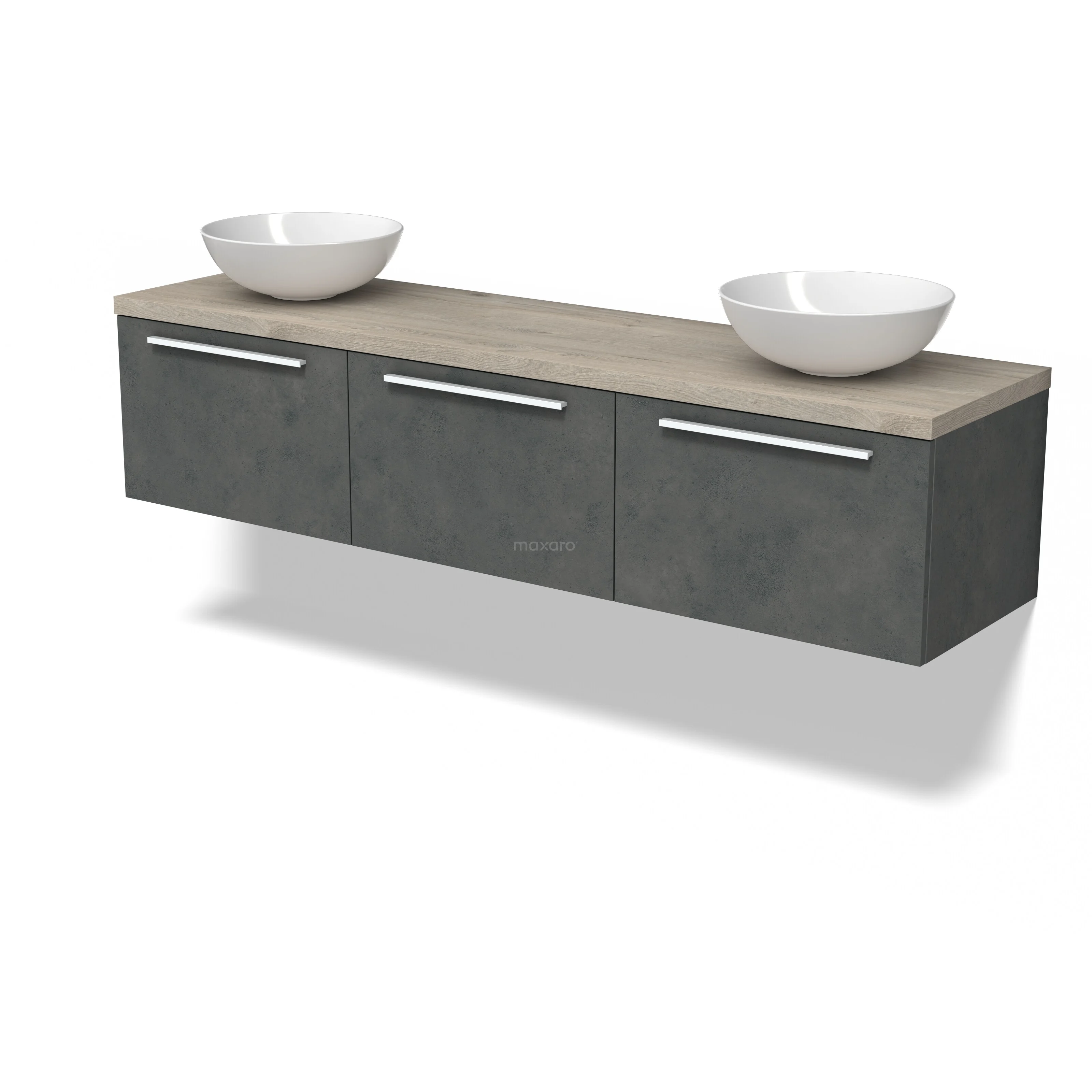 Modulo Plato Badmöbel mit Aufsatzwaschbecken | 180 cm Dunkelgrauer Beton Flach front Hellgraue Eiche blatt 3 nebeneinanderliegende Schubladen