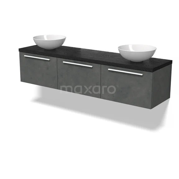Modulo Plato Badmöbel mit Aufsatzwaschbecken | 180 cm Dunkelgrauer Beton Flach front Schwarze Eiche blatt 3 nebeneinanderliegende Schubladen