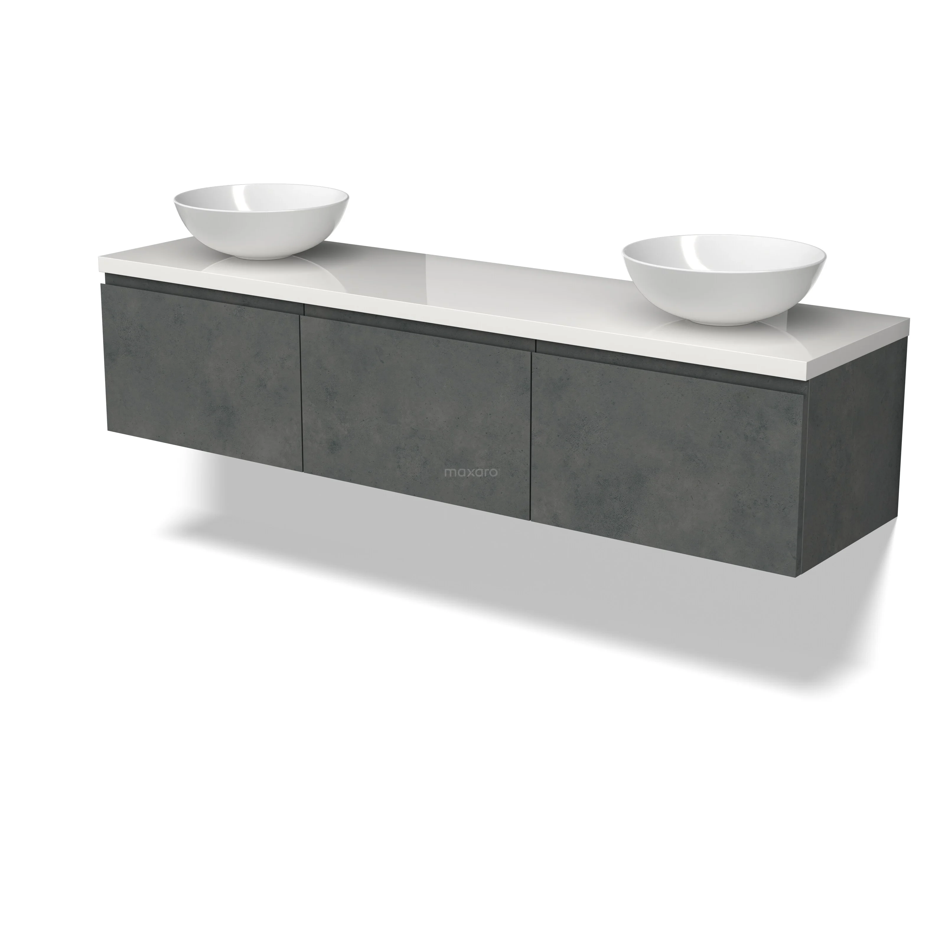 Modulo Plato Badmöbel mit Aufsatzwaschbecken | 180 cm Dunkelgrauer Beton Grifflos front Hochglanz Weiß blatt 3 nebeneinanderliegende Schubladen