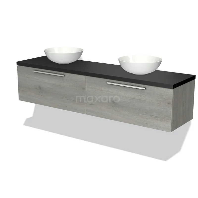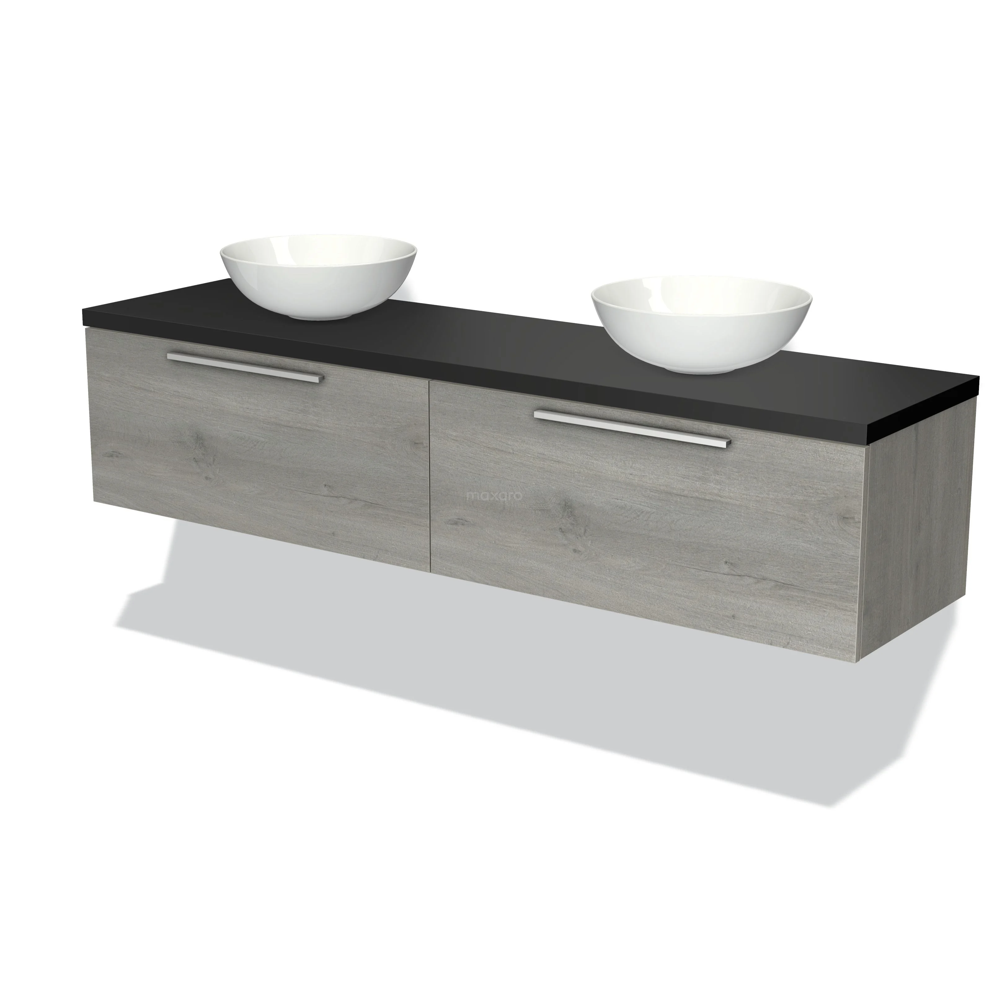 Modulo Plato Badmöbel mit Aufsatzwaschbecken | 180 cm Graue Eiche Flach front Matt Schwarz blatt 2 nebeneinanderliegende Schubladen