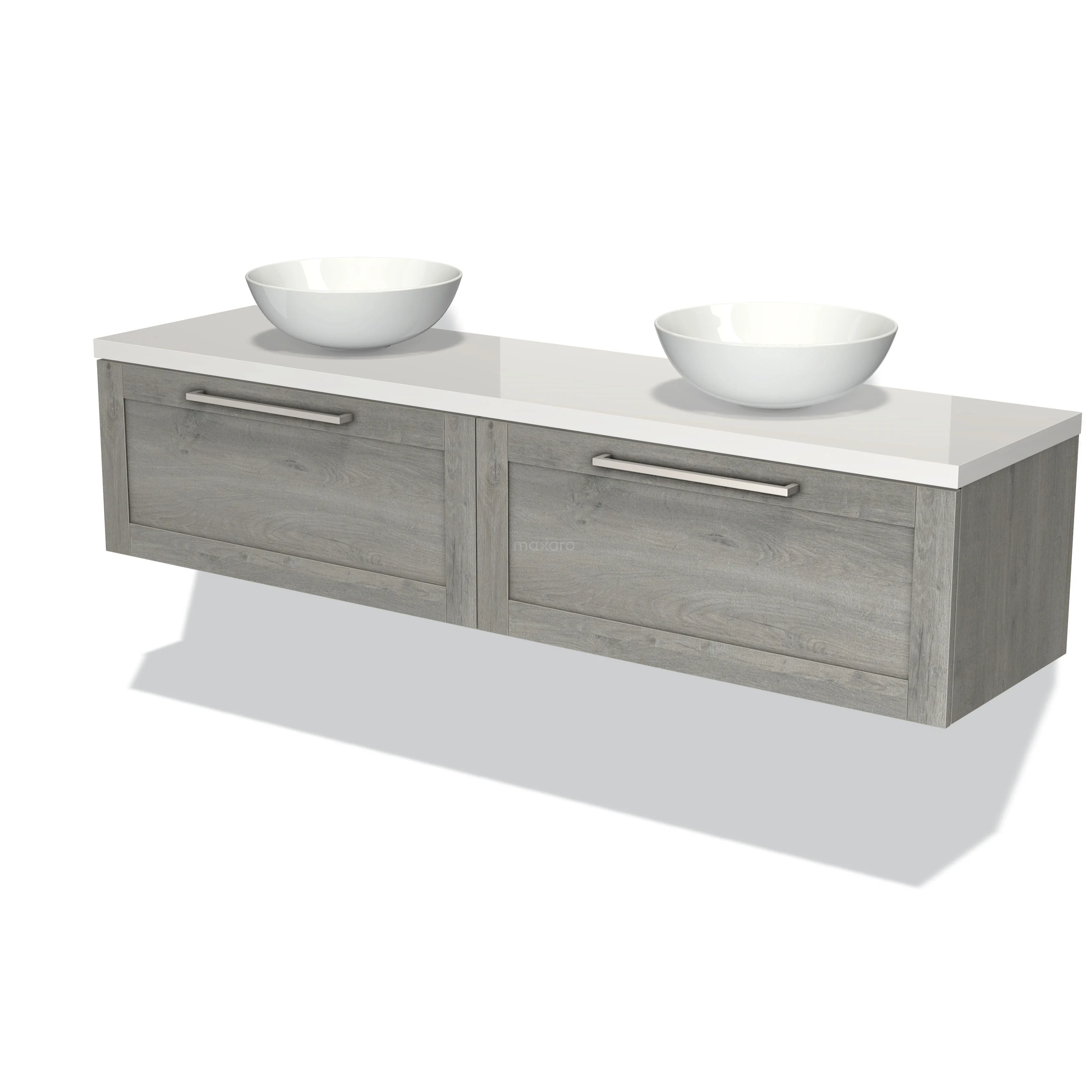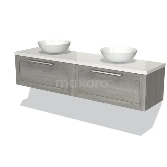 Modulo Plato Badmöbel mit Aufsatzwaschbecken | 180 cm Graue Eiche Rahmen front Hochglanz Weiß blatt 2 nebeneinanderliegende Schubladen