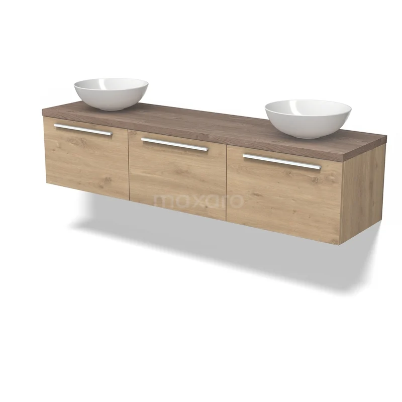 Modulo Plato Badmöbel mit Aufsatzwaschbecken | 180 cm Hellbraune Eiche Flach front Mittelbraune Eiche blatt 3 nebeneinanderliegende Schubladen