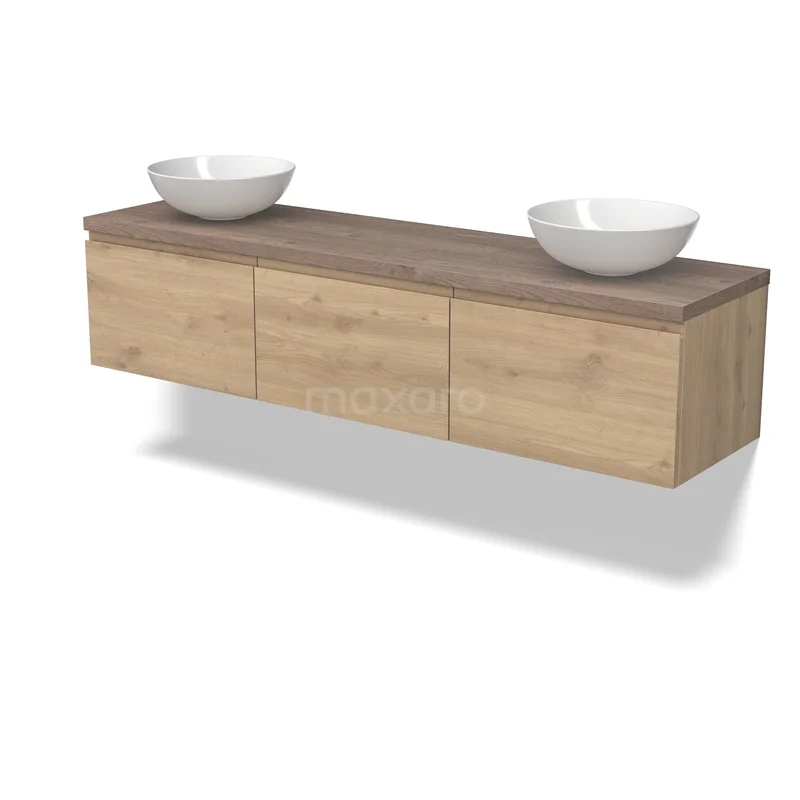 Modulo Plato Badmöbel mit Aufsatzwaschbecken | 180 cm Hellbraune Eiche Grifflos front Mittelbraune Eiche blatt 3 nebeneinanderliegende Schubladen