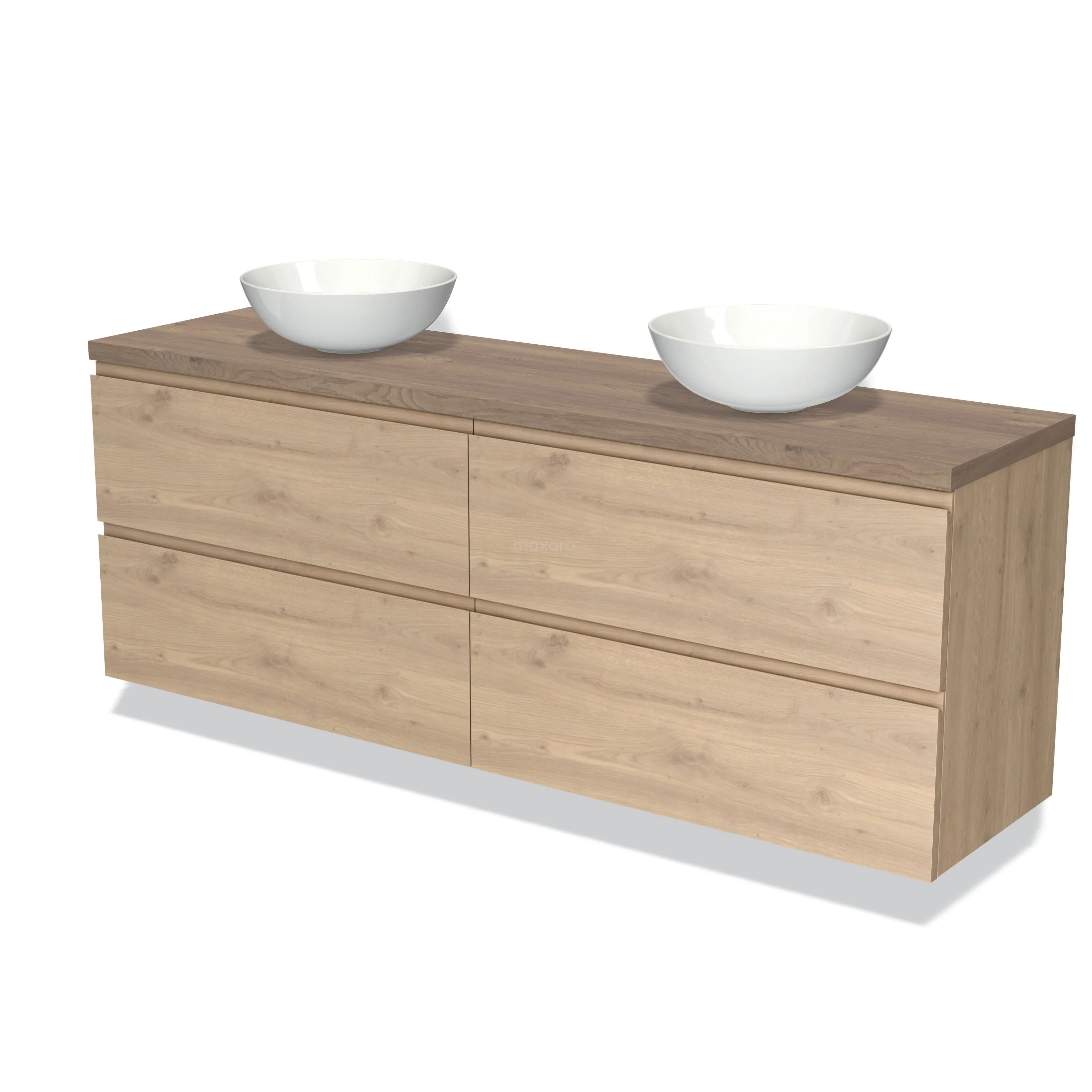 Modulo Plato Badmöbel mit Aufsatzwaschbecken | 180 cm Hellbraune Eiche Grifflos front Mittelbraune Eiche blatt 4 Schubladen