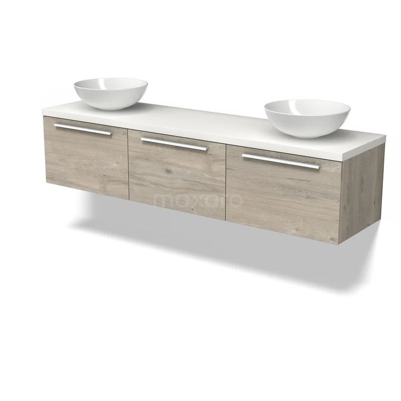 Modulo Plato Badmöbel mit Aufsatzwaschbecken | 180 cm Hellgraue Eiche Flach front Matt Weiß blatt 3 nebeneinanderliegende Schubladen